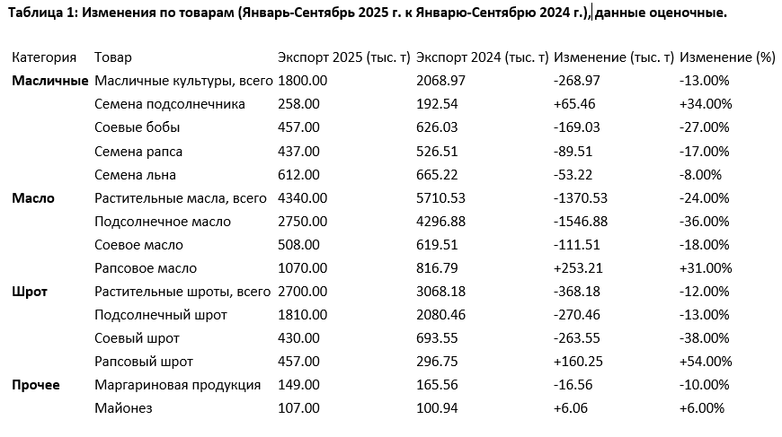 По оценкам аналитиков, экспорт масложировой продукции из России за 9 месяцев 2024 года к 2025 году: