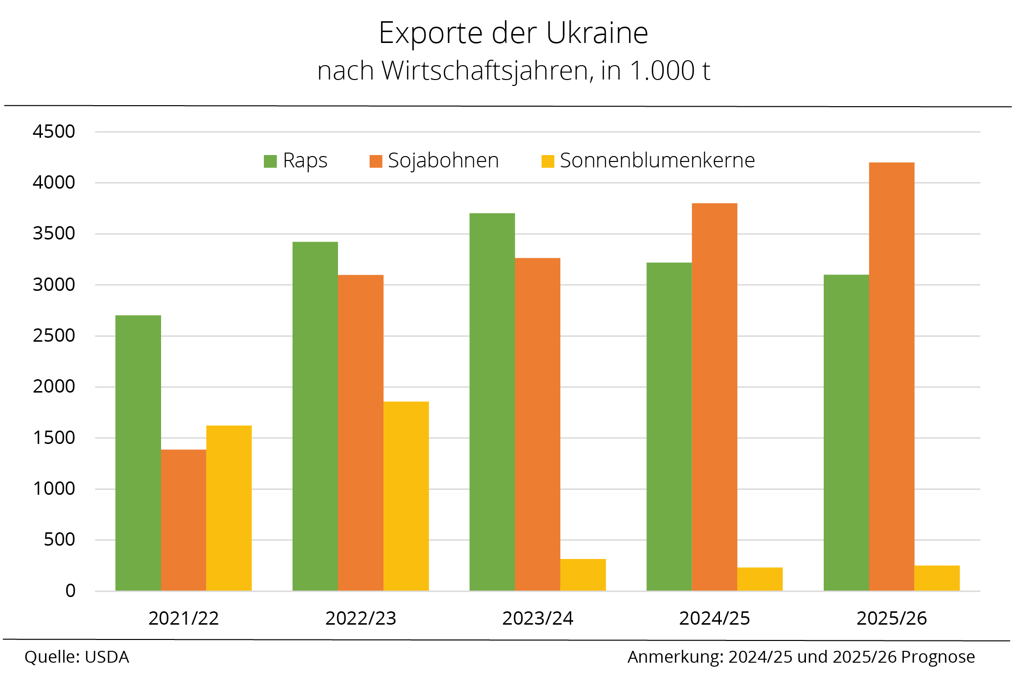 Несмотря на то, что урожай оказался примерно на 2,5 млн тонн ниже, чем в предыдущем сезоне, составив 13 млн тонн, Украина остаётся вторым по величине производителем в мире после России и опережает ЕС. В то же время доля экспорта сырья значительно снизилась по сравнению с прошлым годом. Если в 2022/23 году на мировой рынок было поставлено чуть менее 1,9 млн тонн, то в 2024/25 году этот показатель сократится до всего 230 000 тонн. По оценкам Министерства сельского хозяйства США (USDA), ожидается, что экспорт в текущем сезоне также останется на низком уровне – 250 000 тонн.