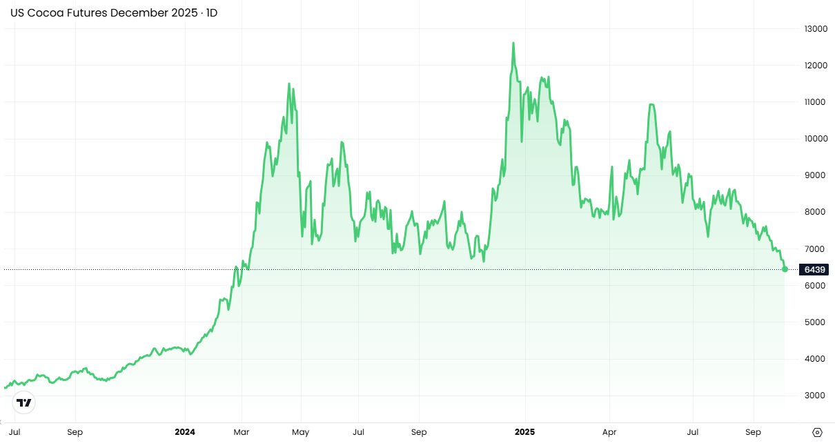 Нью-Йорк. Какао упало на 3,2% до 6511 долларов за тонну после падения до почти годового минимума в 6456 долларов.