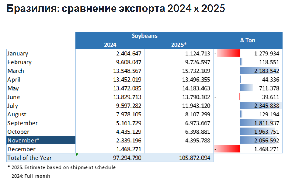 По оценкам отраслевой группы, общий экспорт бразильской сои составит 110 млн тонн в 2025 году по сравнению с 97,3 млн тонн в 2024 году, увеличившись на 13,05%.