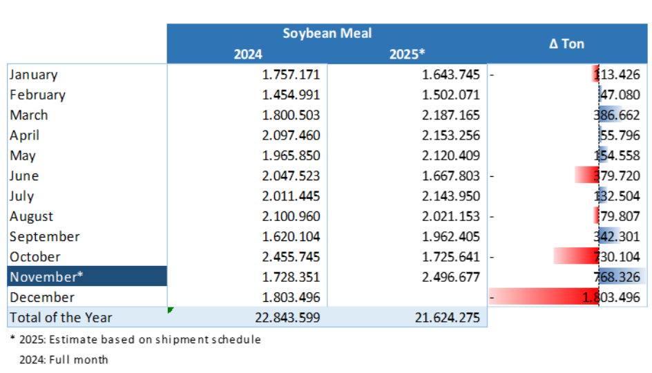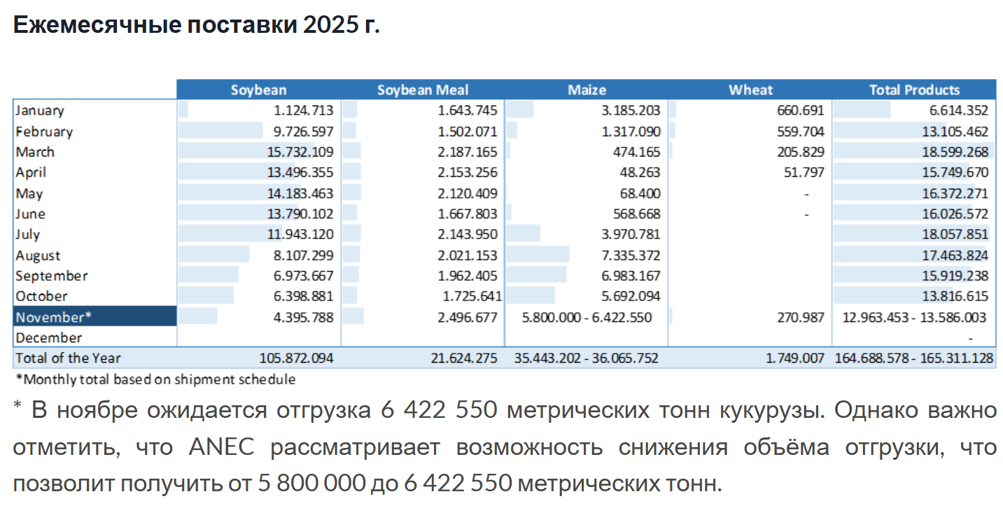 По оценкам ANEC, экспорт соевых бобов из Бразилии в декабре составит 2,81 млн тонн, что на 1,34 млн тонн больше, чем в прошлом году, если прогноз будет реализован.