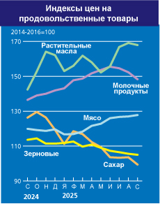 » В сентября 2025 года среднее значение Индекса продовольственных цен ФАО* (ИПЦФ) составило 128,8 пункта, что чуть ниже пересмотренного августовского показателя, когда его значение составляло 129,7 пункта. Снижение индексов цен на зерновые, молочную продукцию, сахар и растительные масла позволило компенсировать рост индекса цен на мясо. В целом значение ИПЦФ оказалось на 4,2 пункта (3,4 процента) выше показателя сентября 2024 года, однако оно все еще на 31,4 пункта (19,6 процента) ниже его рекордного значения, зафиксированного в марте 2022 года.