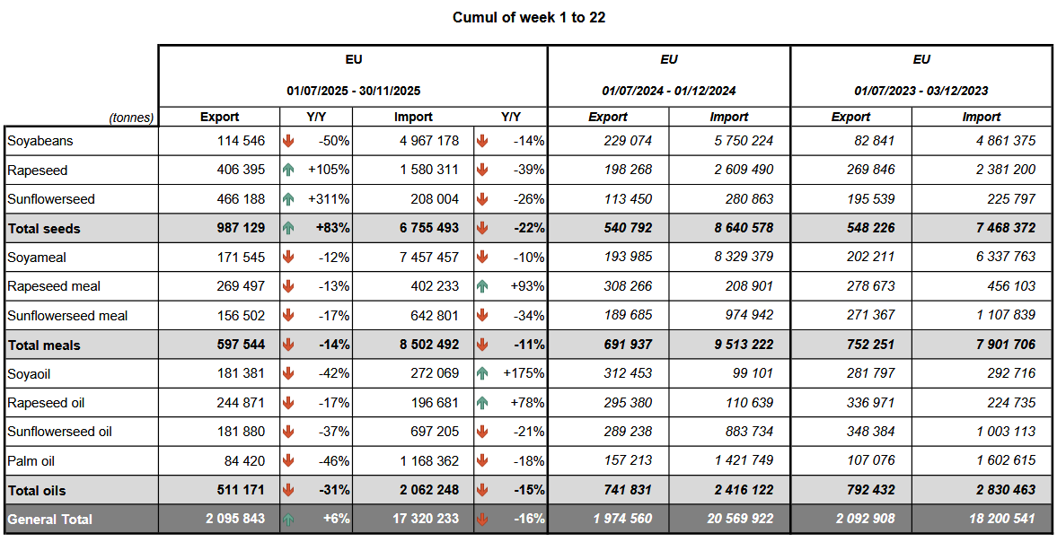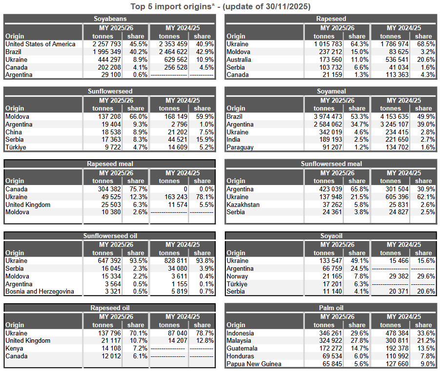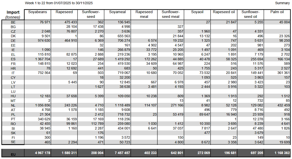 Импорт сои в Европейский союз в сезоне 2025/26, начавшемся в июле прошлого года, достиг 4,97 млн тонн к 30 ноября по сравнению с 5,75 млн тонн годом ранее. Импорт рапса в ЕС за тот же период составил 1,58 млн тонн против 2,61 млн тонн годом ранее.