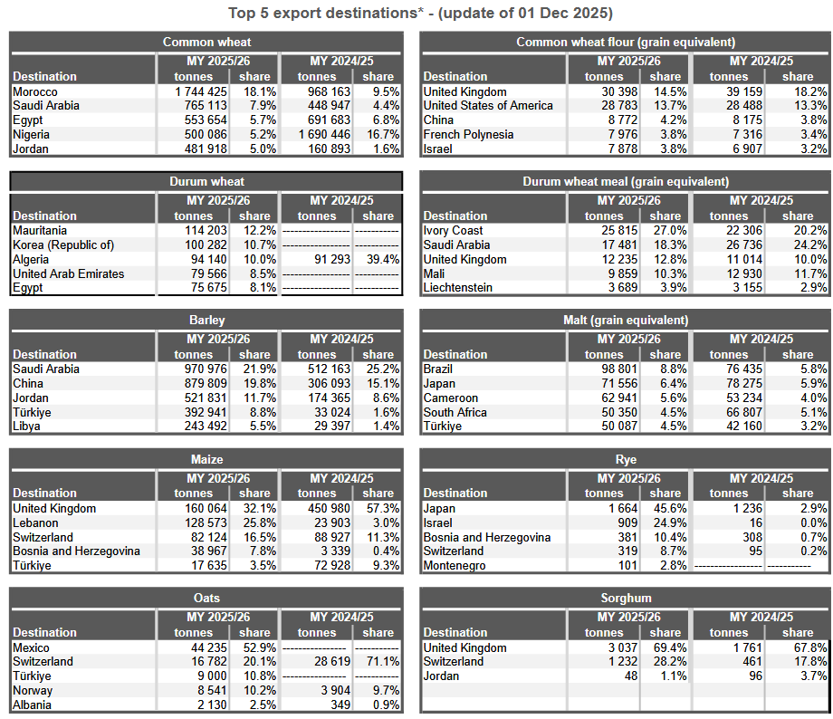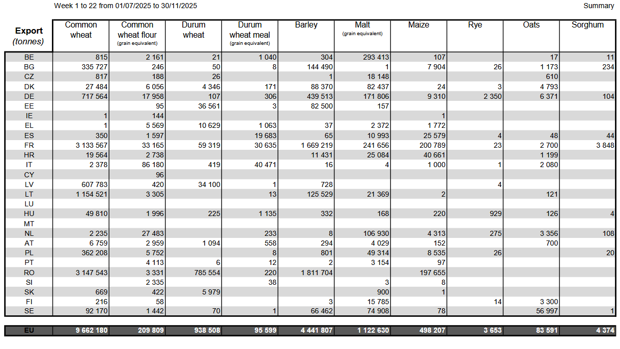 Разбивка объёмов этого сезона показала, что Румыния стала крупнейшим экспортёром мягкой пшеницы из ЕС с объёмом экспорта 3,15 млн тонн, за ней следуют Франция с 3,13 млн тонн, Литва с 1,15 млн тонн, Германия с 0,72 млн тонн и Латвия с 0,61 млн тонн.