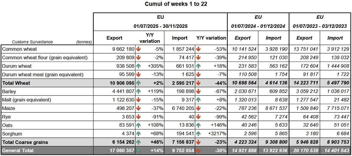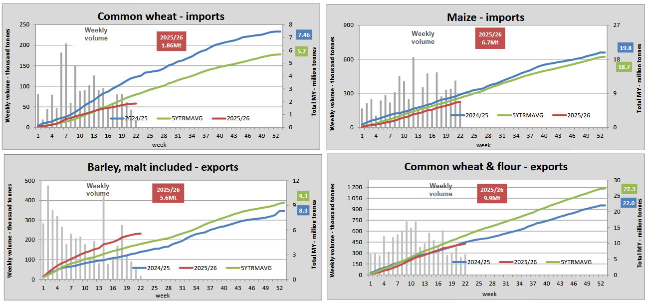 Экспорт мягкой пшеницы из Европейского союза в 2025/26 МГ снизился на 5% по сравнению с аналогичной неделей прошлого года, хотя данные об объёмах этого сезона по некоторым государствам-членам всё ещё отсутствуют, сообщает oilworld.ru со ссылкой на Европейскую комиссию.