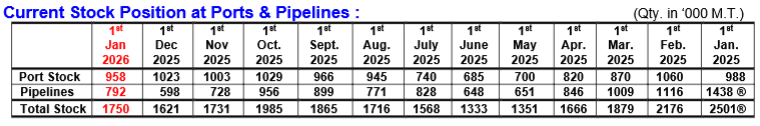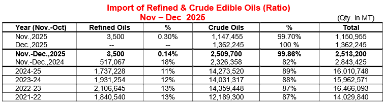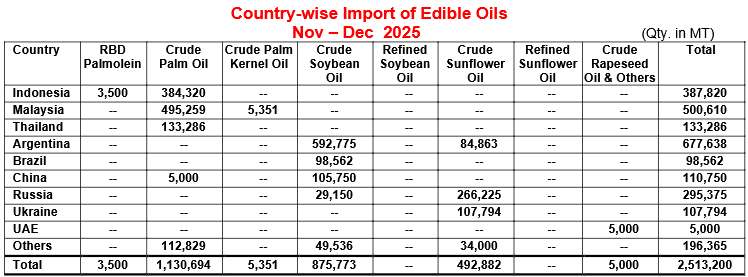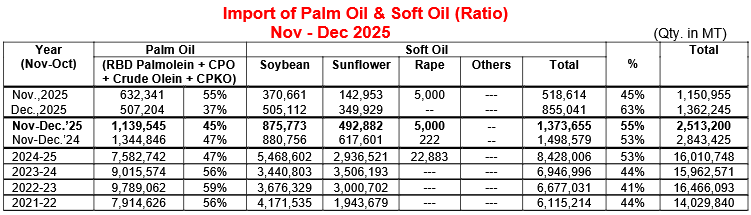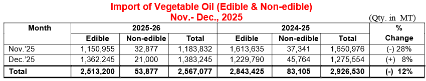 Импорт подсолнечного масла составил 3,50 млн тонн, что более чем удвоилось по сравнению с 1,43 млн тонн в ноябре 2025 года, однако общий объем импорта за первые два месяца сократился до 4,92 млн тонн по сравнению с 6,05 млн тонн, что на 19% меньше. Запасы подсолнечного масла в порту увеличились на 0,75 млн. тонн до 2,00 млн. тонн с 1,25 млн. тонн в предыдущие месяцы.