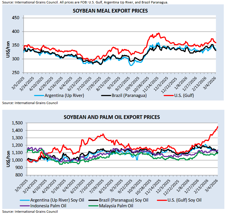 Экспортные цены на соевое масло из США достигли трехлетнего максимума на фоне сохраняющихся ожиданий поддержки обязательств по возобновляемым источникам энергии (RVO) и роста цен на нефть. Аналогичным образом, цены на пальмовое масло в Индонезии превзошли цены на соевое масло в Южной Америке из-за сужения спредов между ценами на пальмовое масло и газойль (POGO), вызванного индонезийским мандатом B40. Цены на соевое масло в Южной Америке снизились, поскольку сезонная переработка активизировалась одновременно с уборкой урожая. Рост цен на соевый шрот за последний месяц был нивелирован из-за опасений по поводу спроса на Ближнем Востоке.