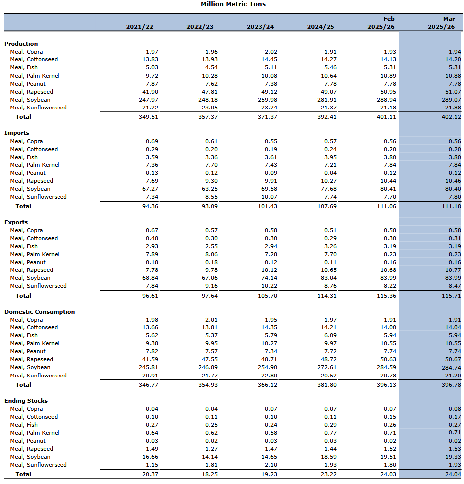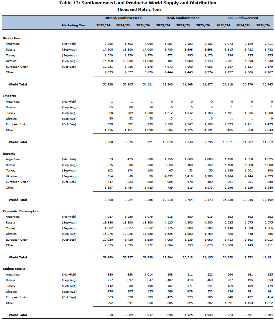 В этом месяце мировое производство масличных культур увеличилось благодаря росту экспорта подсолнечника из Аргентины и Украины, несмотря на снижение производства сои в Аргентине и Украине. Мировая торговля масличными культурами немного снизилась из-за сокращения экспорта сои из Украины и подсолнечника из Казахстана, что не компенсировалось увеличением экспорта подсолнечника из Аргентины. Мировая переработка увеличилась благодаря росту экспорта подсолнечника из Аргентины, Украины и Казахстана. Мировые запасы масличных культур увеличились благодаря увеличению поставок рапса из Австралии и подсолнечника из Аргентины. Мировая торговля протеиновым шротом увеличилась, в основном, из-за увеличения экспорта подсолнечного шрота из Аргентины. Мировая торговля растительными маслами увеличилась благодаря увеличению экспорта подсолнечного масла из Аргентины и Украины.