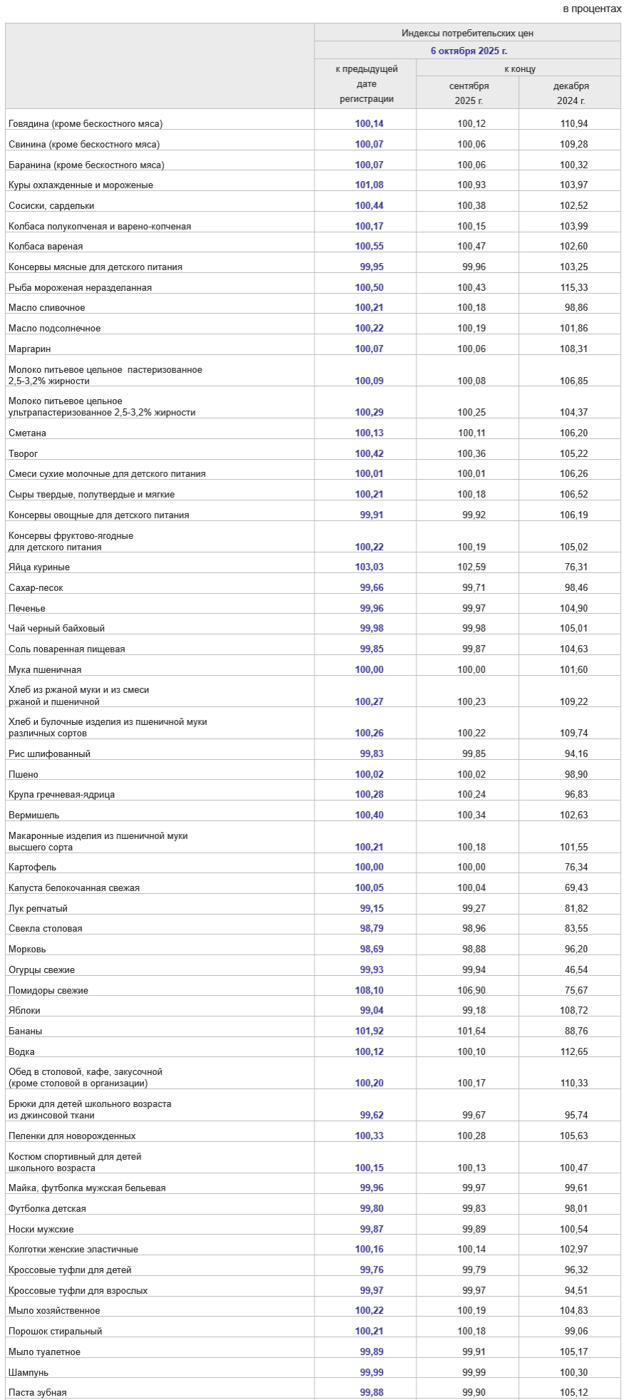 За период с 30 сентября по 6 октября 2025 г. индекс потребительских цен, по оценке Росстата, составил 100,23%, с начала месяца – 100,20%, с начала года – 104,53% (справочно: октябрь 2024 г. – 100,75%, с начала года – 106,57%).