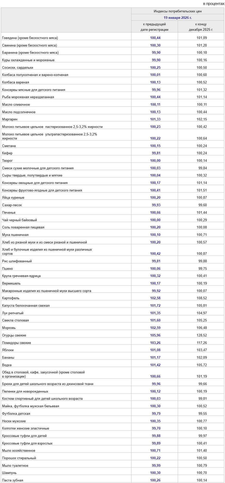 За период с 13 по 19 января 2026 г. цены изменились: на водку +1,4%, маргарин +1,3%, печенье и обеды в столовой, кафе, закусочной (кроме столовой в организации) +0,7%, говядину, рыбу мороженую, хлеб пшеничный, консервы фруктово-ягодные для детского питания +0,4%, свинину, сосиски, сардельки и крупу гречневую +0,3%, молоко, сметану, яйца куриные, консервы овощные для детского питания, хлеб ржаной, вермишель и соль поваренную +0,2%, колбасы вареные, масло сливочное и подсолнечное, муку пшеничную и пшено +0,1%.