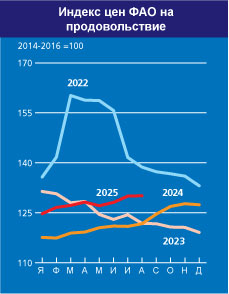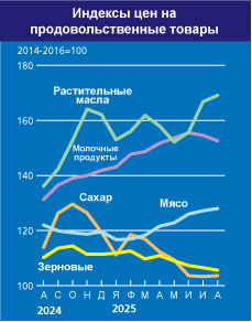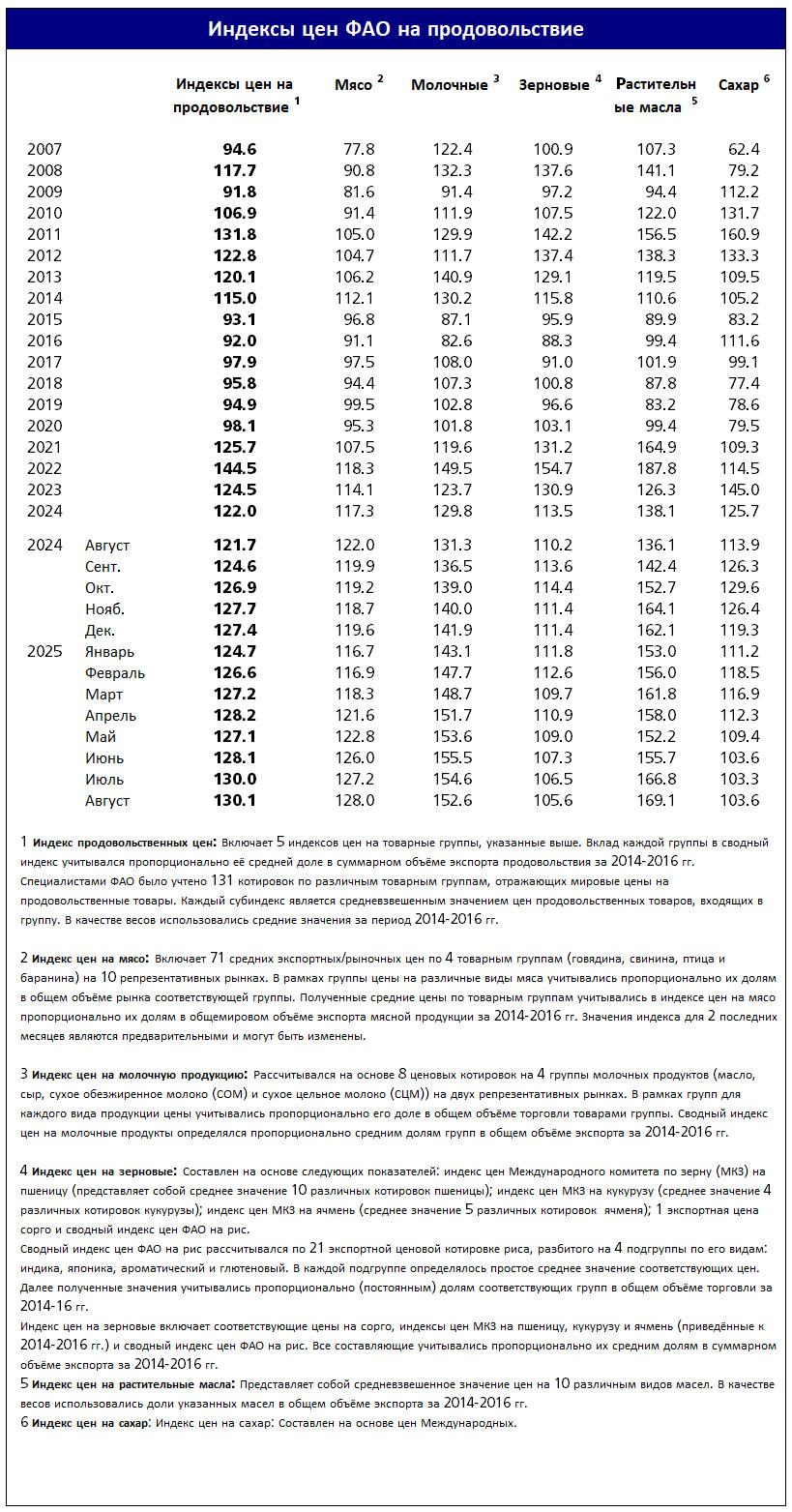 » В августе 2025 года среднее значение Индекса продовольственных цен ФАО* (ИПЦФ) составило 130,1 пункта, практически не изменившись по сравнению с пересмотренным прогнозом на июль, когда его значение составляло 130,0 пункта. Рост значений индексов цен на мясо, сахар и растительные масла был компенсирован снижением значений индексов цен на зерновые и молочную продукцию. В целом значение ИПЦФ оказалось на 8,4 пункта (6,9 процента) выше показателя августа 2024 года, однако оно все еще на 30,1 пункта (18,8 процента) ниже его рекордного значения, зафиксированного в марте 2022 года.