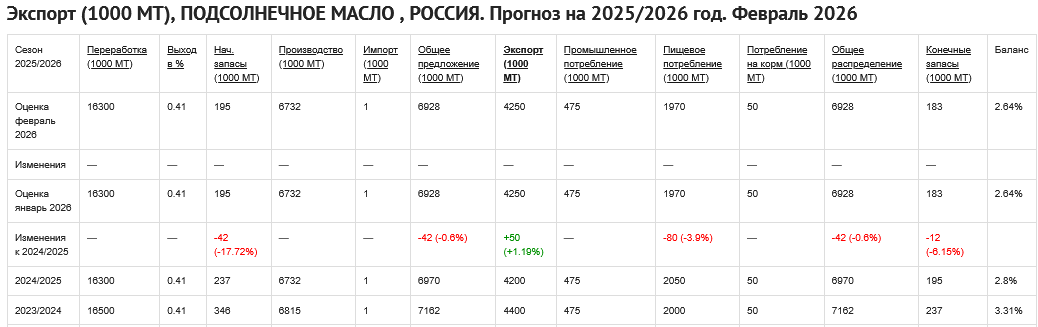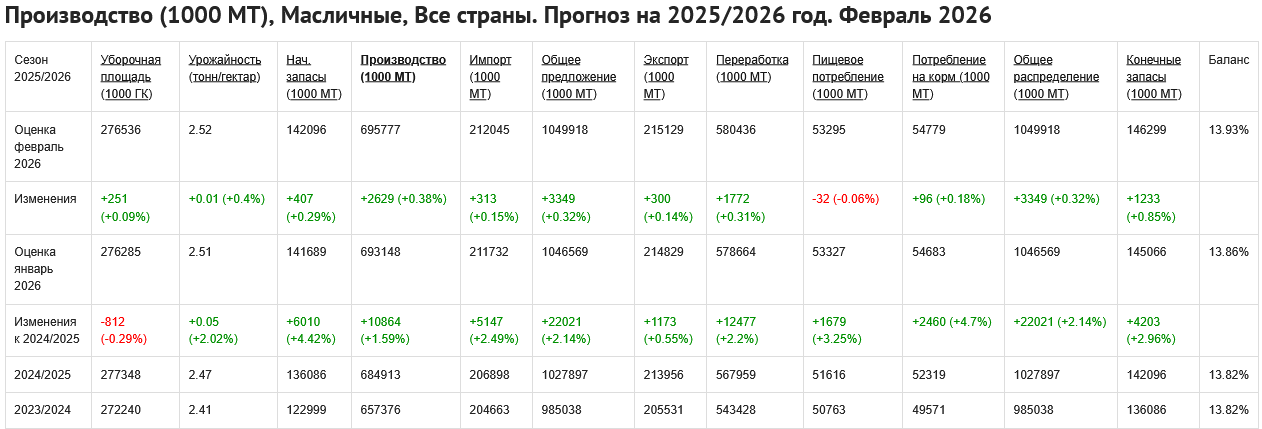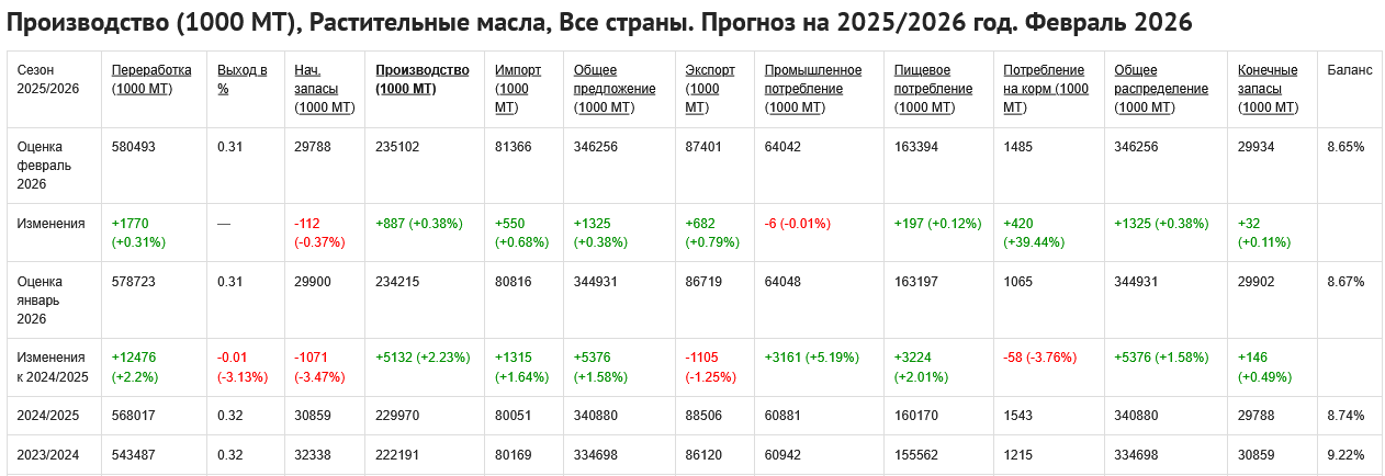 Мировые запасы масличных культур увеличились за счет увеличения перенесенных поставок соевых бобов из Бразилии. Мировая торговля протеиновым шротом увеличилась за счет увеличения экспорта соевого шрота из Бразилии. Мировая торговля растительными маслами увеличилась за счет увеличения экспорта пальмового масла из Малайзии и увеличения мирового экспорта соевого масла от основных поставщиков. Запасы растительных масел остались без изменений.
