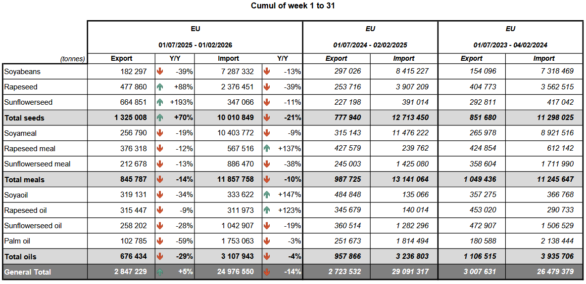 Импорт соевых бобов в Европейский Союз на сезон 2025/26, начавшийся в июле, к 1 февраля достиг 7,29 млн метрических тонн, что на 13% меньше, чем за аналогичный период прошлого года, показали данные Европейской комиссии во вторник.