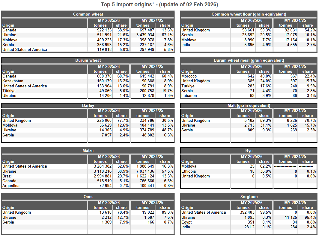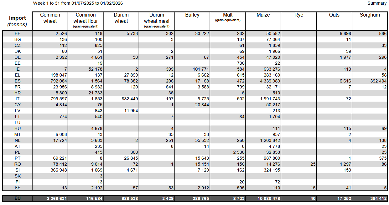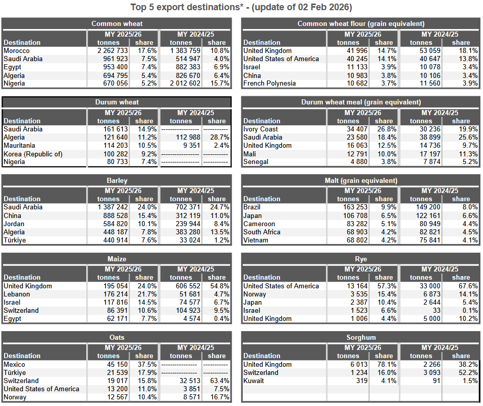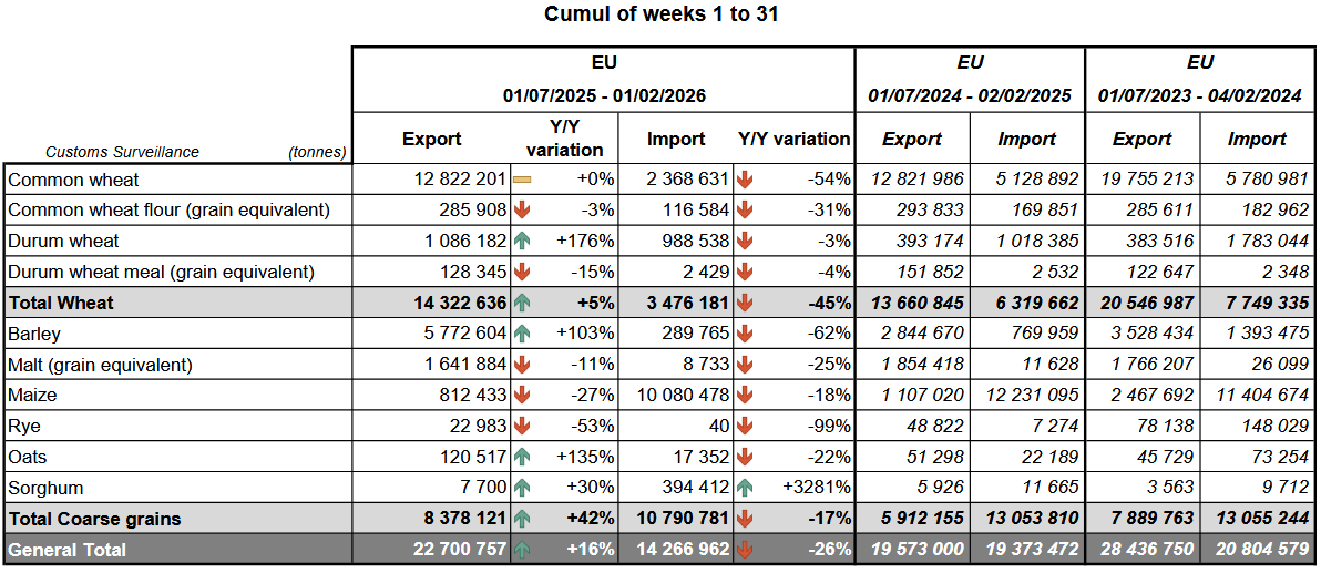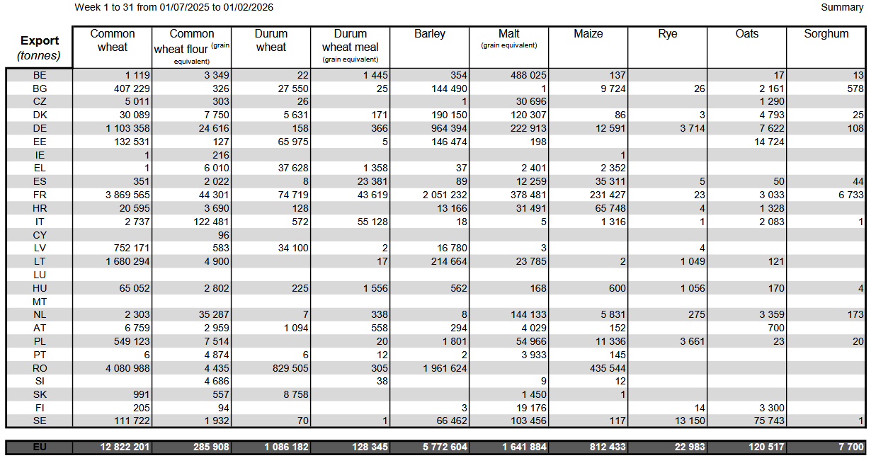 Экспорт мягкой пшеницы из Европейского союза с начала сезона 2025/26 в июле достиг 12,82 млн метрических тонн к 1 февраля, по сравнению с 12,38 млн тонн на предыдущей неделе и без изменений по сравнению с аналогичным периодом прошлого года.