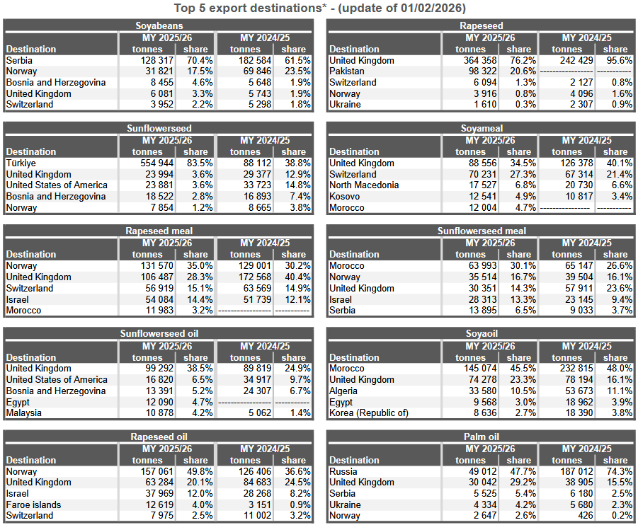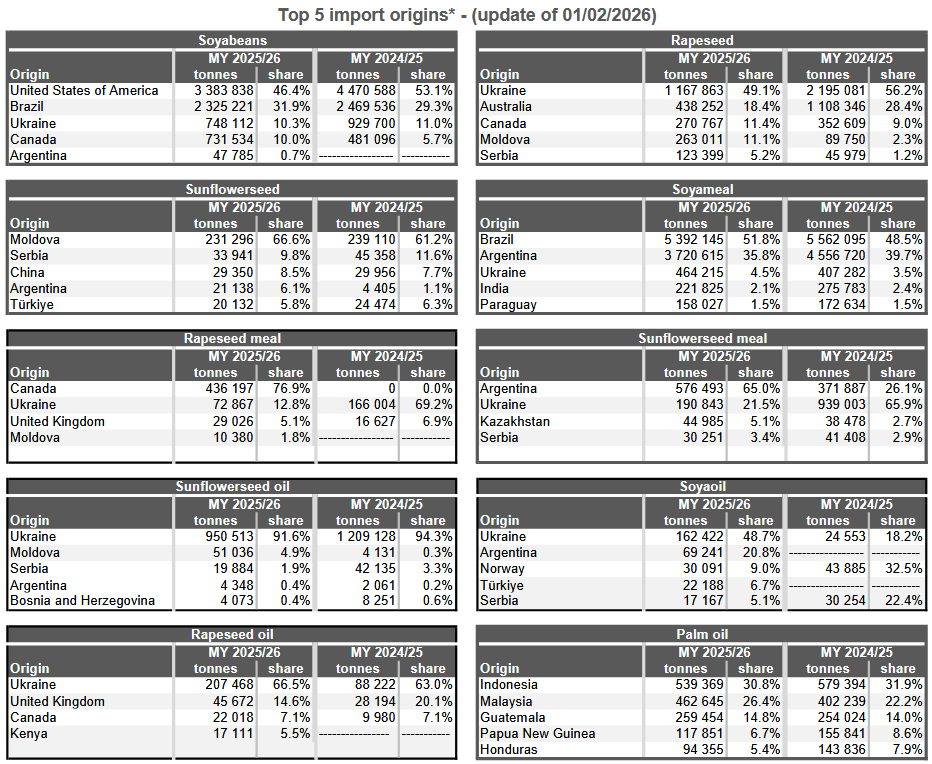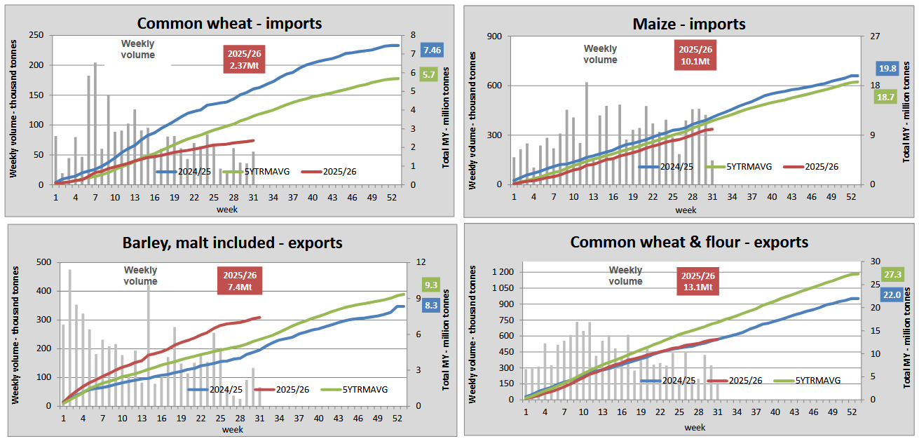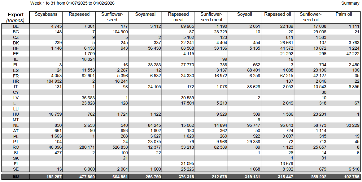 *Данные по экспорту Франции не являются полными с начала 2024 календарного года. Данные по экспорту Болгарии и Ирландии не являются полными с начала 2023/24 маркетингового года. Данные по импорту и экспорту Польши отсутствуют с октября 2025 года. Службы Комиссии поддерживают контакты с заинтересованными государствами-членами, работая над решением этих проблем.