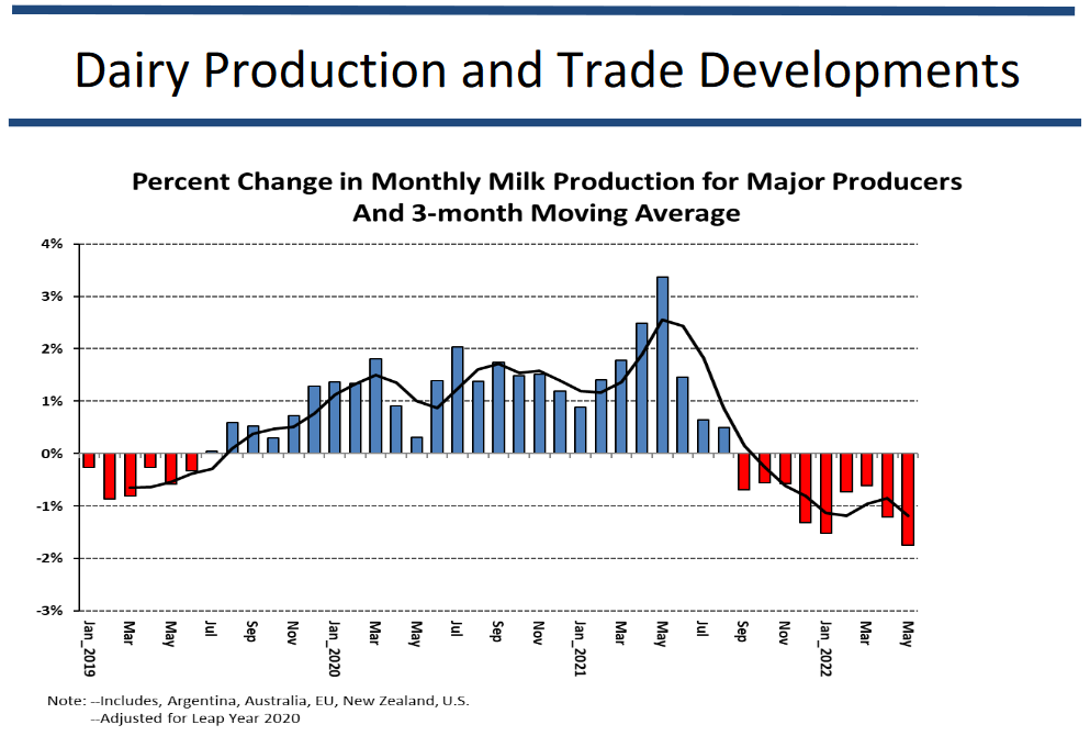 Среди основных стран-экспортеров молочной продукции, до мая, только в Аргентине производство молока выросло по сравнению с прошлым годом (+1%), в Австралии (-6%). Европейский Союз (-1 процент), Новая Зеландия (-6 процентов) и Соединенные Штаты (-1 процент) все замеченные запасы попадают под давление. В будущем глобальные поставки, вероятно, останутся ограниченными, поскольку жаркие и засушливые условия в Европейском Союзе (ЕС) увеличивают дискомфорт коров ... полный текст обзора см. файл (на англ. яз)