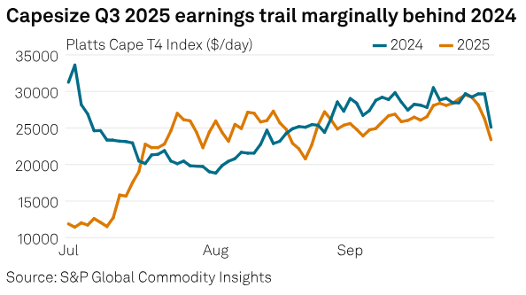 По данным S&P Global Commodity Insights, индекс Platts Capesize T4, глобальный средневзвешенный индекс четырех маршрутов Capesize, в третьем квартале 2025 года составил в среднем 23 394 долл. США в день, что ниже показателя в 25 032 долл. США в день в третьем квартале 2024 года, сообщает oilworld.ru со ссылкой на S&P Global Platts.