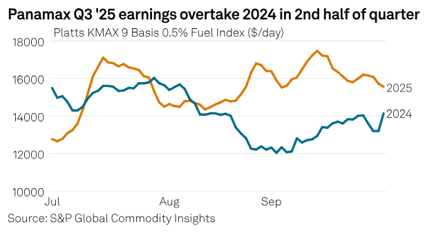 Между тем, индекс Platts KMAX9, глобальный средневзвешенный показатель тонно-миль по девяти маршрутам Panamax, в третьем квартале составил в среднем 15 562 долл. США в день, что представляет собой существенное улучшение по сравнению с 14 145 долл. США в день за тот же период 2024 года.