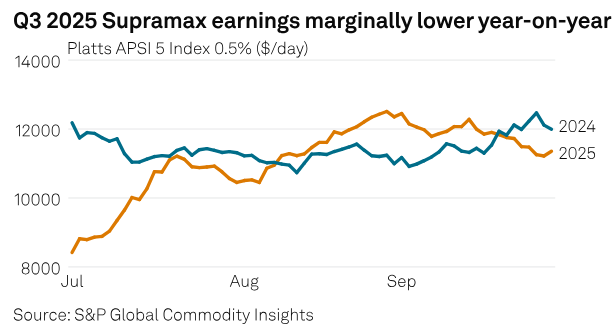 Аналогичным образом, индекс Platts APSI 5 (средневзвешенный показатель в тонно-милях по пяти маршрутам грузовых перевозок Supramax в Азиатско-Тихоокеанском регионе) в третьем квартале составил в среднем 11 135 долларов США в день, что незначительно ниже среднего показателя в 11 408 долларов США в день, зафиксированного в третьем квартале 2024 года.