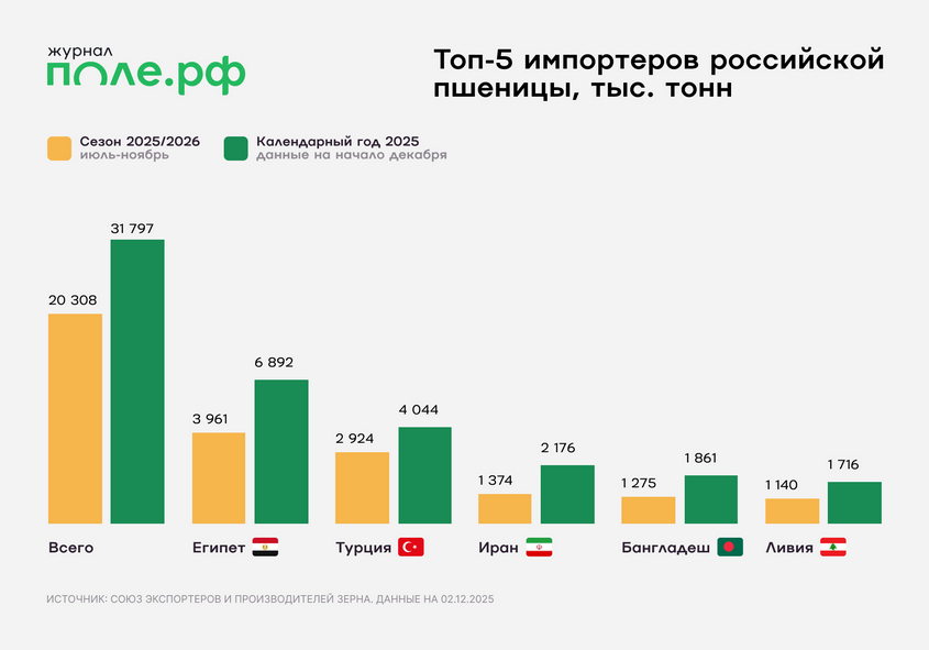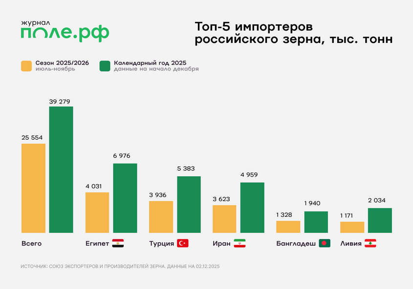 Хотя динамика экспорта в 2026 году будет зависеть от нового урожая, основной пул стран — импортеров зерна, скорее всего, останется стабильным. Ключевые позиции вновь займут Египет, Турция, Иран, Бангладеш. Внутри группы возможны перестановки, которые будут определяться климатом и собственным урожаем зерна в этих странах.