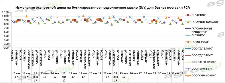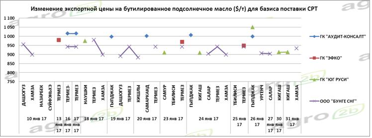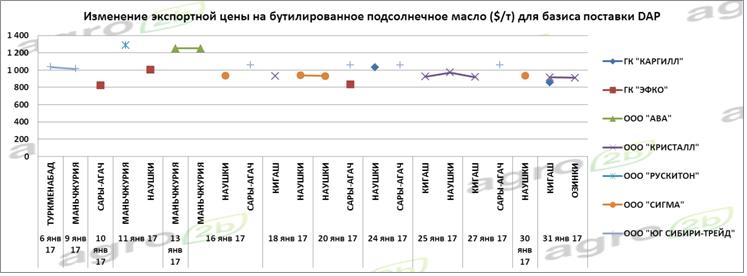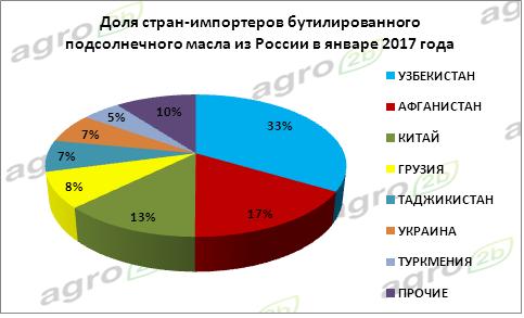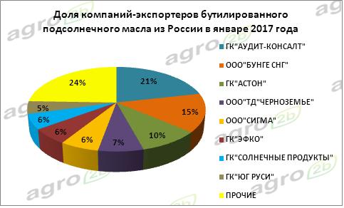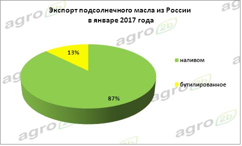 За период 01.01.2017 — 31.01.2017 года российские компании экспортировали без учета данных по странам Таможенного союза (Казахстан, Белоруссия, Армения, Киргизия) подсолнечное масло в общем объеме 158,8 тыс. тонн. Из которых 138,9 тыс. тонн составило подсолнечное масло наливом, 19,8 тыс. тонн — бутилированное подсолнечное масло. За исследуемый период отгрузка подсолнечного масла сократилась на 65 тыс. тонн.