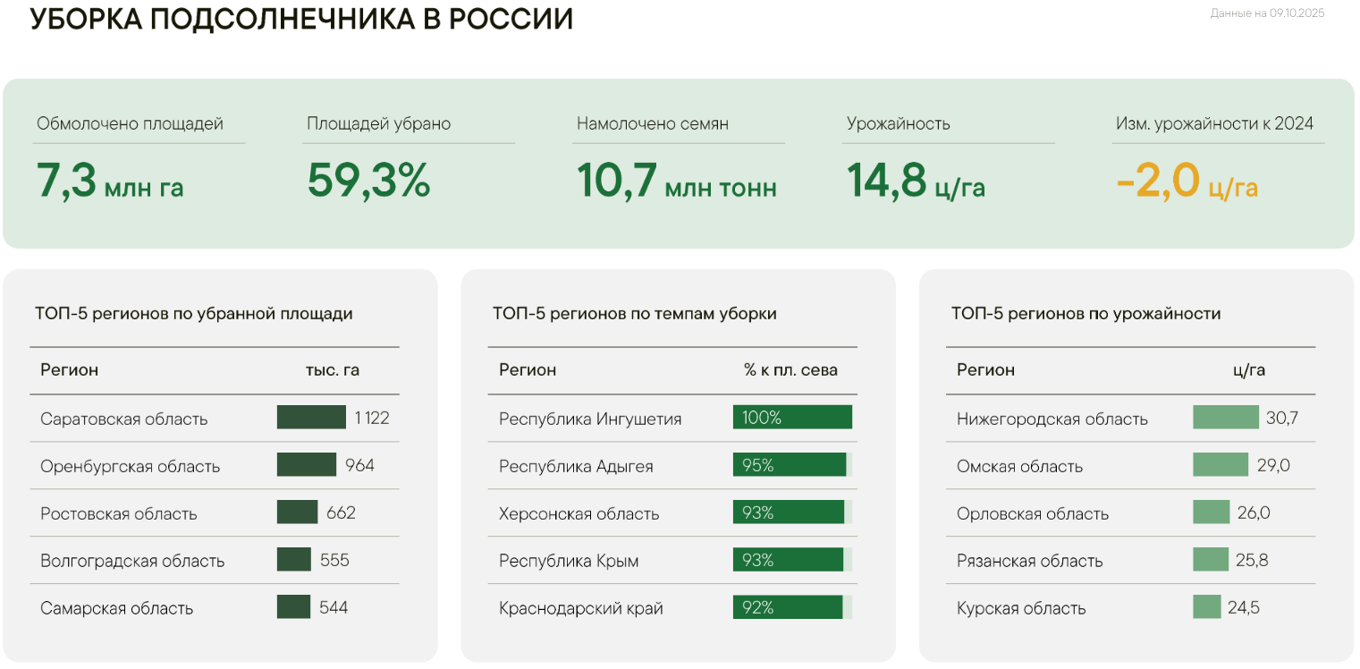Подсолнечник: слегка выше прошлогодних, средняя урожайность на текущую дату на 12% ниже, наибольшее снижение — в регионах ЮФО.