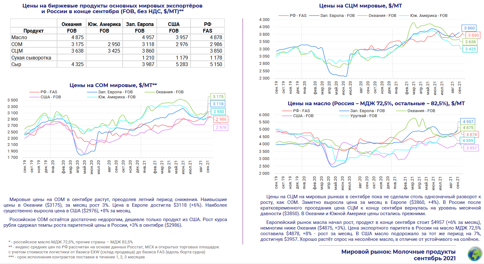 * Мировой рынок сухого молока сбалансирован, несмотря на некоторое сезонное движение цен. В Южном полушарии выпуск сезонно увеличивается, как и запасы южноамериканских производителей. На них фокусируют свой спрос потребители в Северном полушарии. Мировые цены на СОМ в сентябре сезонно растут, пройдя период летнего снижения, на СЦМ - устойчивы.