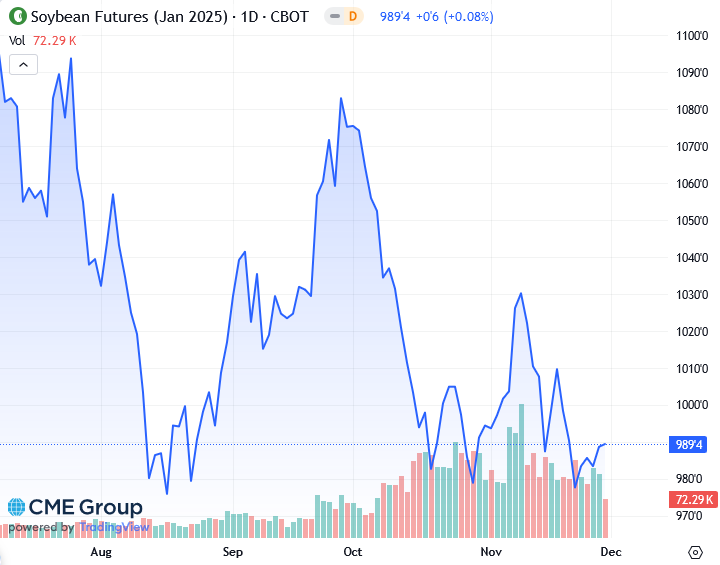Январские фьючерсы на соевые бобы на CBOT выросли на 3/4 цента до 9,89-1/2 доллара за бушель. Спотовые ставки на соевые бобы, поставляемые баржами на побережье Мексиканского залива США, в пятницу снизились, хотя трейдеры продолжают говорить о китайском спросе на рынке.