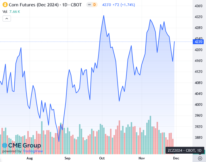 Декабрьский фьючерс на кукурузу CBOT вырос на 7,4 цента до 4,23 доллара за бушель, в то время как наиболее активный мартовский фьючерс на кукурузу вырос на 5 центов до 4,33 доллара за бушель.