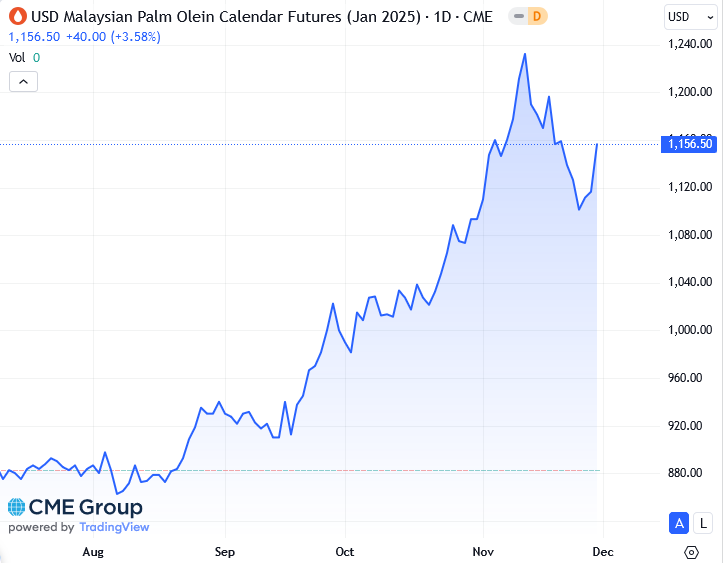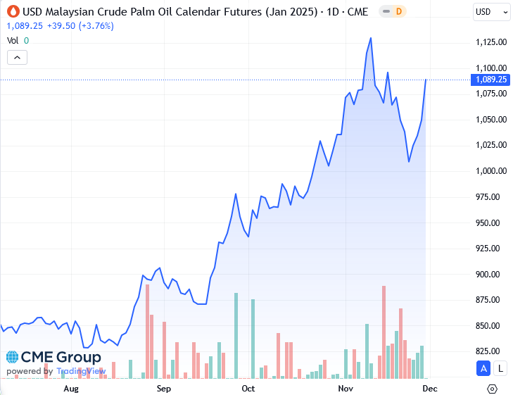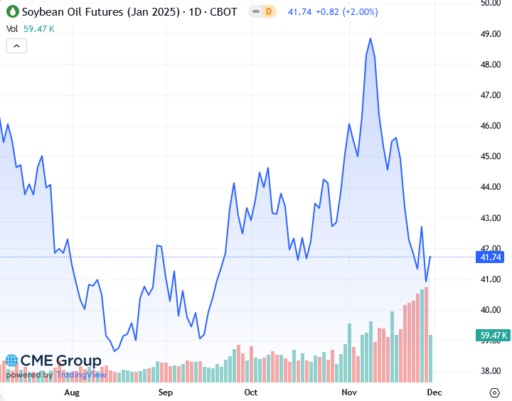 Декабрьский фьючерс на соевое масло на CBOT вырос на 0,86 цента до 41,61 цента за фунт, в то время как наиболее активный январский фьючерс на соевое масло вырос на 0,82 цента до 41,74 цента за фунт.