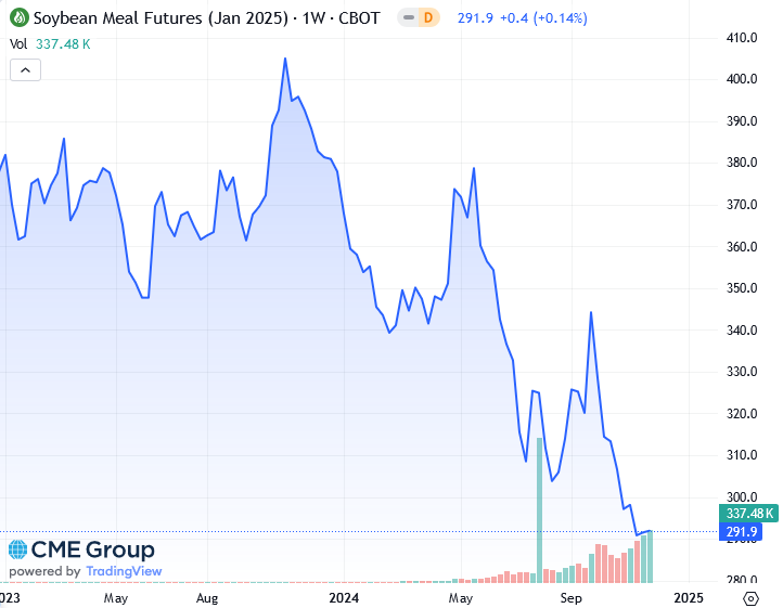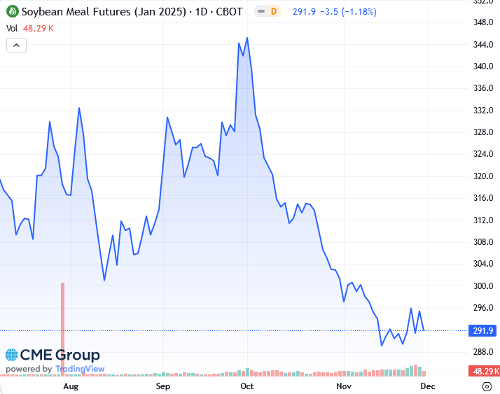 Декабрьский фьючерс на соевый шрот на CBOT закрылся с понижением на $3,40 до $287,10 за короткую тонну, в то время как наиболее активный январский фьючерс на соевый шрот закрылся с понижением на $3,50 до $291,90 за короткую тонну.