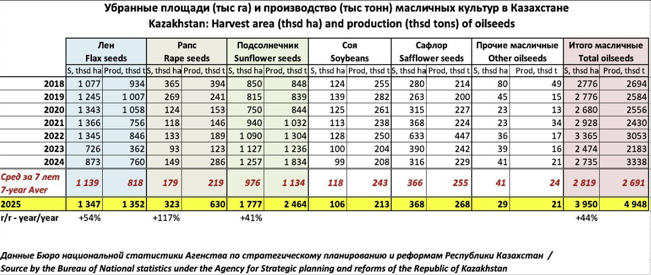 Масличные убраны с площади 3 950 тыс га (+44%), собрано 4 948 тыс т (+48%) - самый высокий результат за всю историю, в том числе: