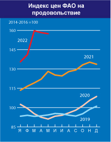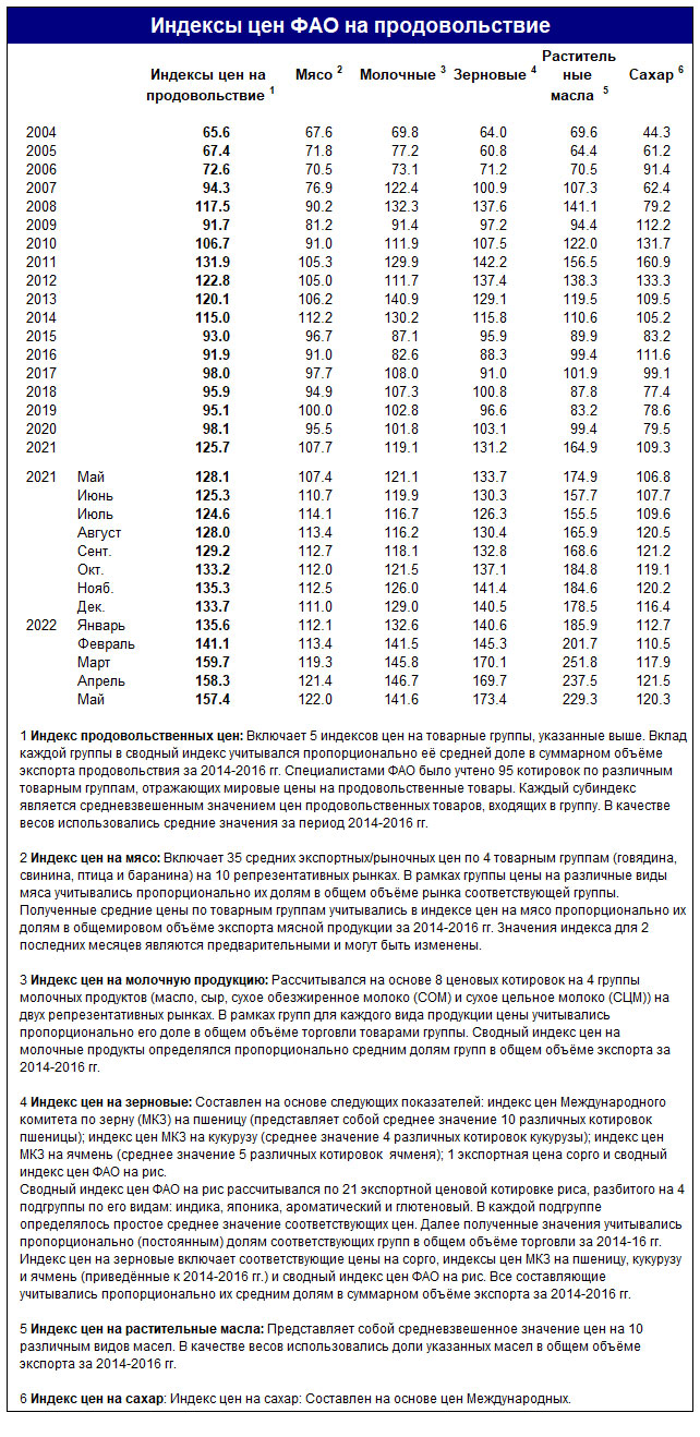 » В мае 2022 года среднее значение Индекса продовольственных цен ФАО* (ИПЦФ) составило 157,4 пункта, что на 0,9 пункта (0,6 процента) ниже показателя апреля; такое падение наблюдается уже второй месяц подряд, однако этот показатель на 29,2 пункта (22,8 процента) выше, чем в соответствующий период прошлого года. Главными факторами такого снижения в мае были индексы цен на растительные масла и молочную продукцию, причем индекс цен на сахар также снизился, но на меньшую величину. В то же время, индексы цен на зерновые и мясо выросли сообщает oilworld.ru со ссылкой на ФАО.