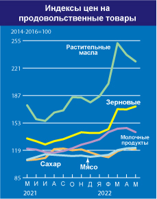 » Среднее значение Индекса цен на растительные масла ФАО в мае составило 229,3 пункта, что на 8,3 пункта (3,5 процента) ниже показателя прошлого месяца, но все же заметно выше уровня мая прошлого года. Это снижение по сравнению с прошлым месяцем отражает падение цен на пальмовое, подсолнечное, соевое и рапсовое масла. Мировые цены на пальмовое масло в мае незначительно снизились. Помимо снижения спроса снижению цен также способствовала отмена Индонезией кратковременного запрета на экспорт пальмового масла; однако их дальнейшее снижение сдерживалось сохраняющейся неопределенностью относительно перспектив экспорта из этой страны. В то же время мировые котировки подсолнечного масла упали по сравнению с наблюдавшимися недавно рекордными уровнями, поскольку на Украине его товарные запасы продолжают увеличиваться в связи логистическими трудностями. Мировые цены на соевое и рапсовое масла также несколько снизились в мае, главным образом под влиянием вялого импортного спроса в связи с ростом затрат в последние несколько месяцев.