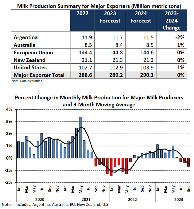 2023 финансовый год был непростым годом для Американских экспортеров молочной продукции, пострадавших от вялого экономического роста и ростом конкуренции с Новой Зеландией и ЕС. Однако некоторое ослабление доллара США в 2023 году помогло компенсировать потери в конкурентоспособности. В течение года, стоимость экспорта обезжиренного сухого молоко (NDM), сыра и сыворотки оставалась низкой, прежде всего из-за ослабления спроса в Китае и Юго-Восточной Азии. В глобальном масштабе более высокие процентные ставки повлияли на дискреционные расходы, особенно на потребление молочных продуктов, которые не являются традиционным продуктом азиатской диеты – наиболее значительного региона роста для основных экспортеров.