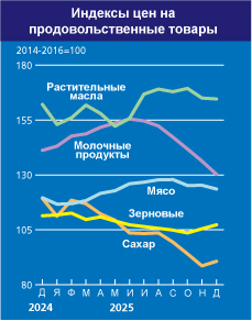 » Среднее значение Индекса цен на растительные масла ФАО в декабре опустилось до минимального значения за последние 6 месяцев и составило 164,6 пункта, что на 0,4 пункта (0,2 процента) ниже уровня ноября. Такое снижение было обусловлено сокращением мировых цен на соевое, рапсовое и подсолнечное масла, с лихвой компенсировавшим увеличение котировок пальмового масла. Мировые цены на соевое масло снизились из-за наличия значительного экспортного предложения в Северной и Южной Америке, в то время как рост объемов производства рапса в Австралии и Канаде оказал понижательное давление на рынки рапсового масла. Что касается подсолнечного масла, то в декабре цены на него продолжили снижаться второй месяц подряд под влиянием вялого мирового импортного спроса, обусловленного ослаблением конкурентоспособности цен. При этом международные цены на пальмовое масло немного выросли, что в значительной степени обусловлено ожидаемым сезонным замедлением производства в Юго-Восточной Азии, нивелировавшим фактор более высоких, чем ожидалось, объемов производства и роста запасов в Малайзии в конце 2025 года. По итогам 2025 года среднее значение Индекса цен на растительные масла ФАО составило 161,6 пункта, что на 23,6 пункта (17,1 процента) выше по сравнению с аналогичным периодом прошлого года, достигнув максимальных уровней за последние три года на фоне ограниченного предложения в мире.