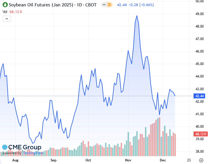 Январские фьючерсы на соевое масло на CBOT упали на 0,28 цента до 42,44 цента за фунт.