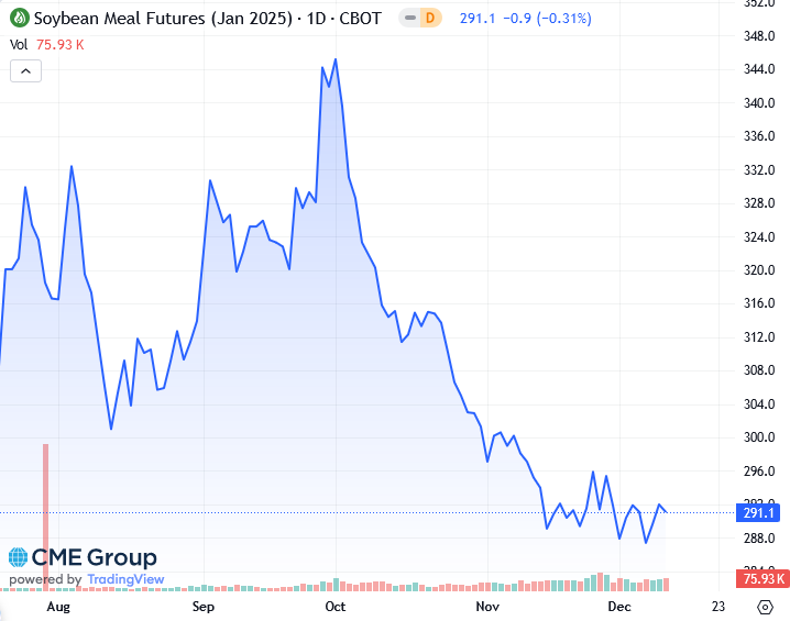 Январские фьючерсы на соевый шрот на CBOT закрылись снижением на $0,90 до $291,10 за короткую тонну.