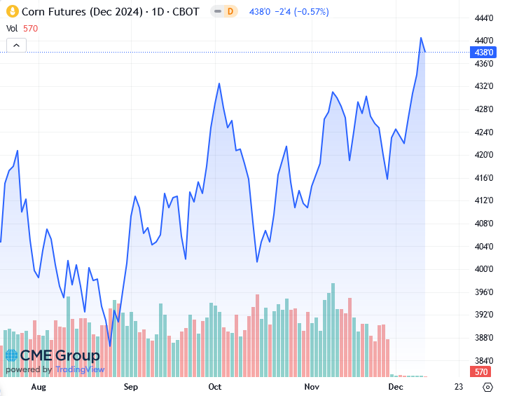 Dec 24 Corn is at $4.42 1/2, up 2 cents,