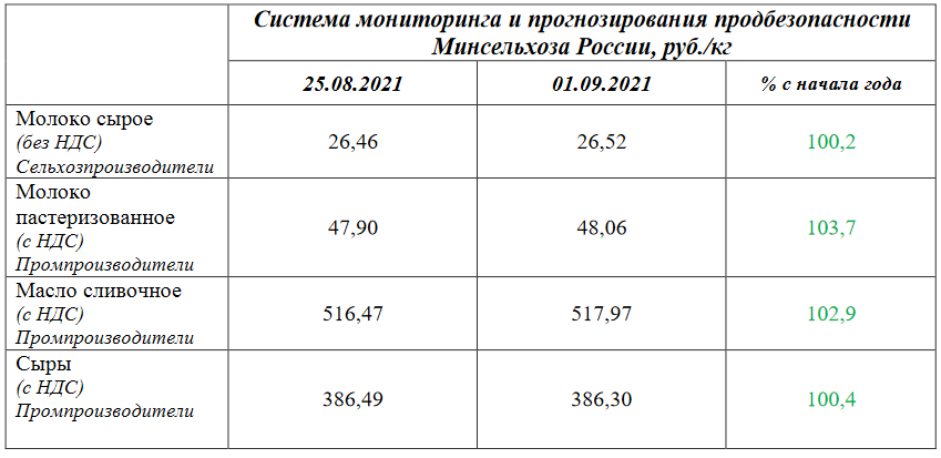 По данным Росстата объем промышленного производства молока, кроме сырого в январе-июле 2021 года составил 3 218,7 тыс. т (на 0,3% выше аналогичного периода 2020 года), продуктов кисломолочных (кроме творога) – 1 634,6 тыс. т (-1,3%), сыров – 345,1 тыс. т (+5,3%), молокосодержащих продуктов с заменителем молочного жира, произведенных по технологии сыра – 111,7 тыс. т (-0,1%), масла сливочного – 159,9 тыс. т (-4,8%), молока и сливок сухих – 95,6 тыс. т (-2,3%).