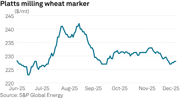 Агентство Platts, входящее в S&P Global Energy, оценило стоимость мукомольной пшеницы на 11 декабря на уровне $229,89 за тонну, не изменившись день ото дня.